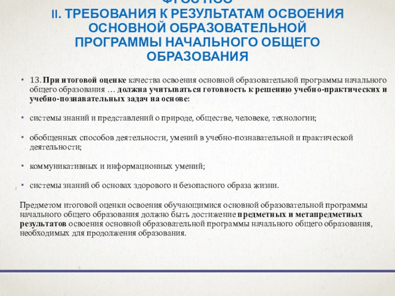 13. При итоговой оценке качества освоения основной образовательной программы начального общего образования … должна учитываться готовность к решению учебно-практических и учебно-познавательных задач на основе: