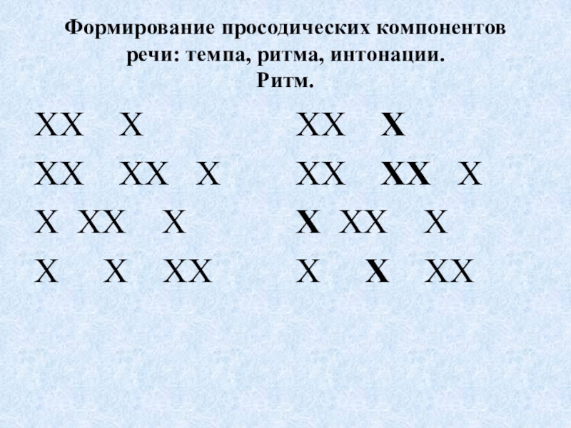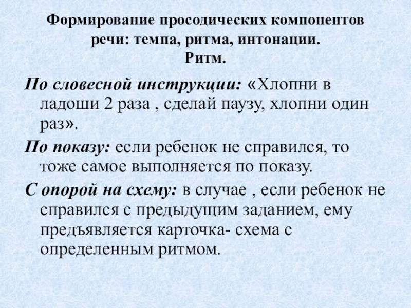 Слайд 60Формирование просодических компонентов речи: темпа, ритма, интонации.