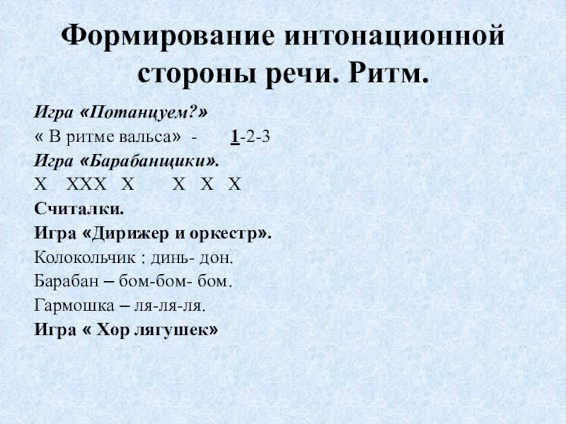 Слайд 62Формирование интонационной стороны речи. Ритм.