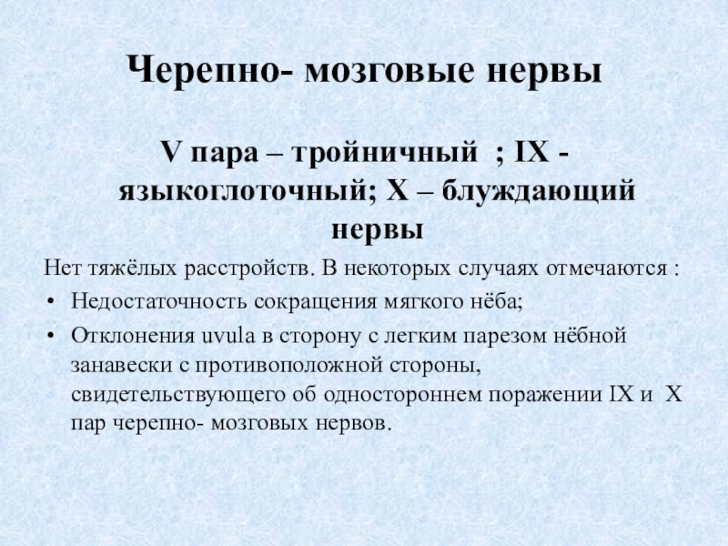 Отклонения uvula в сторону с легким парезом нёбной занавески с противоположной стороны, свидетельствующего об одностороннем поражении IX и X пар черепно- мозговых нервов.