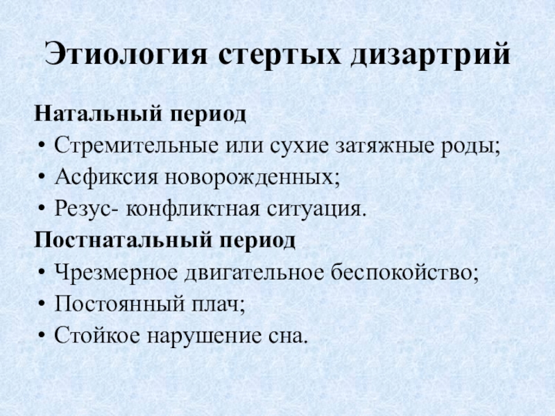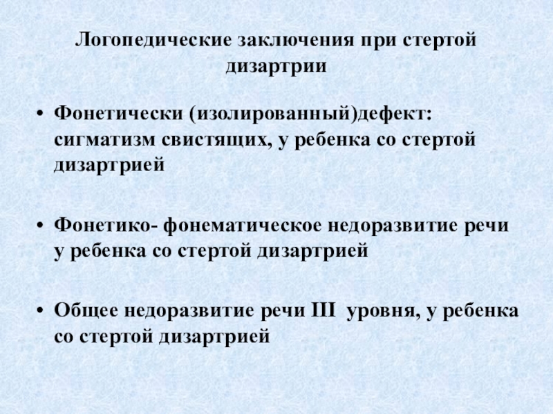 и у детей наблюдающихся с диагнозом «сложная дислалия» при тщательном обследовании стертая дизартрия выявляется в 6-10%.