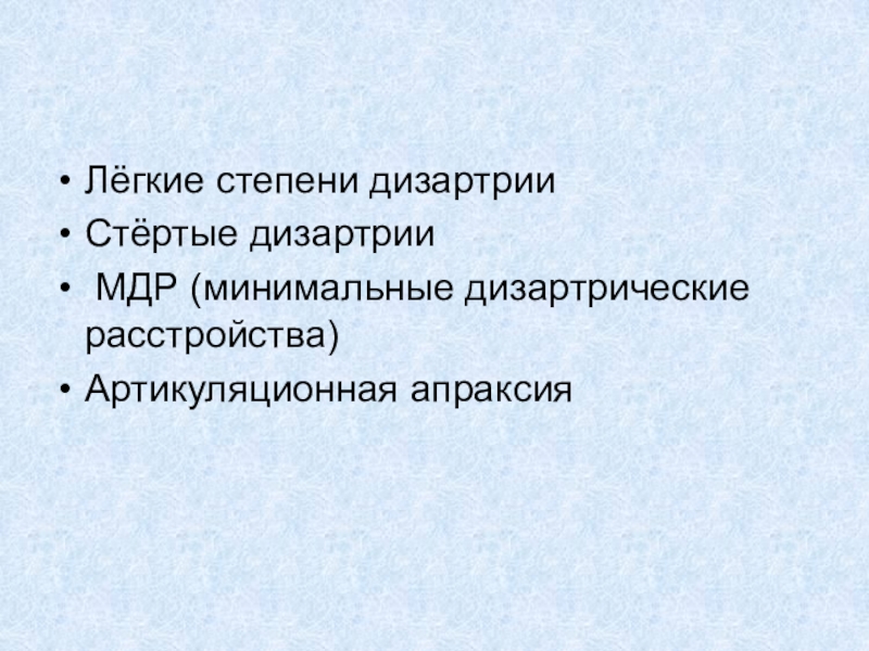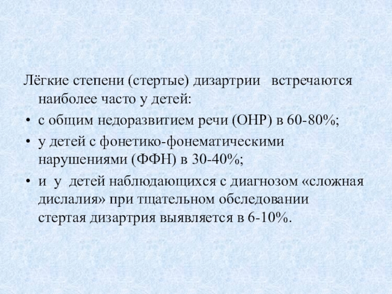 Слайд 6Лёгкие степени (стертые) дизартрии встречаются наиболее часто у детей: