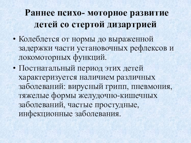 Постнатальный период этих детей характеризуется наличием различных заболеваний: вирусный грипп, пневмония, тяжелые формы желудочно-кишечных заболеваний, частые простудные, инфекционные заболевания.