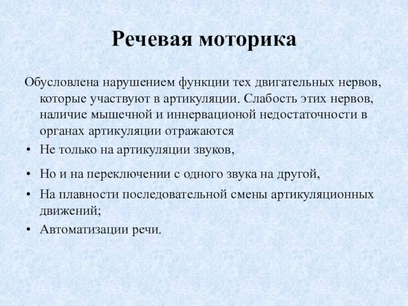 речи), которые обусловлены недостаточностью иннервации мышц речевого аппарата (дыхательного, голосового, артикуляционного). Таким образом, при дизартрии нарушается именно двигательный механизм речи за счет органического поражения центральной нервной системы.