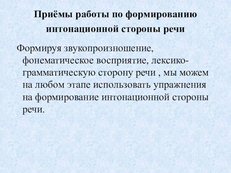 восприятие, лексико- грамматическую сторону речи , мы можем на любом этапе использовать упражнения на формирование интонационной стороны речи.