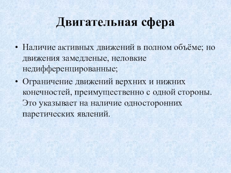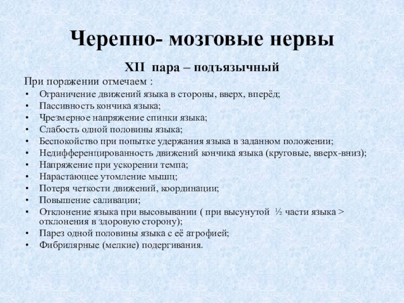 Отклонение языка при высовывании ( при высунутой ½ части языка > отклонения в здоровую сторону);