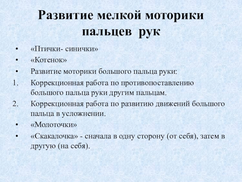 Коррекционная работа по развитию движений большого пальца в усложнении.