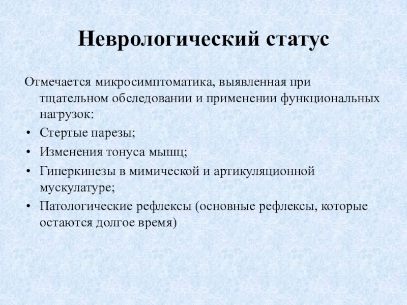 Отмечается микросимптоматика, выявленная при тщательном обследовании и применении функциональных нагрузок: