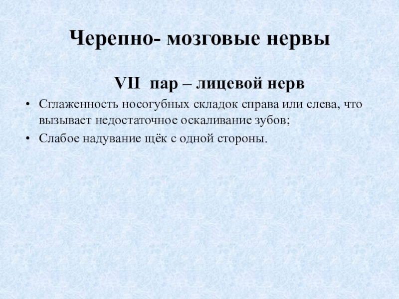 Это свидетельствует о нарушении сосательного рефлекса, о возможном наличии пареза артикуляционных мышц губ и языка. Частые поперхивания, обильные срыгивания указывают на возможность паретического состояния мышц, иннервируемых языко- глоточным нервом.
