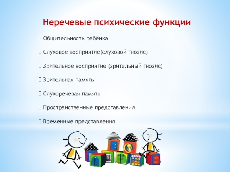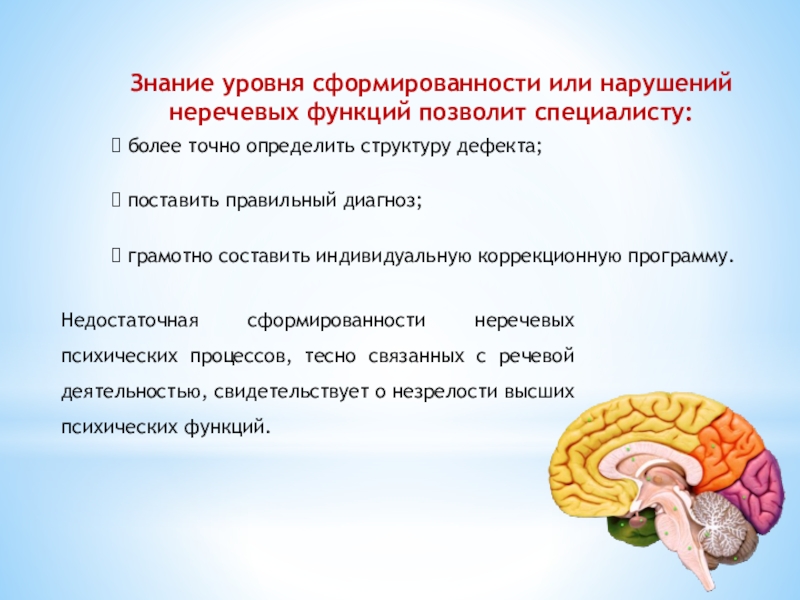 Недостаточная сформированности неречевых психических процессов, тесно связанных с речевой деятельностью, свидетельствует о незрелости высших психических функций.