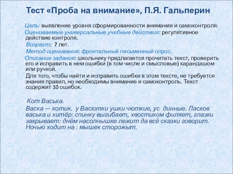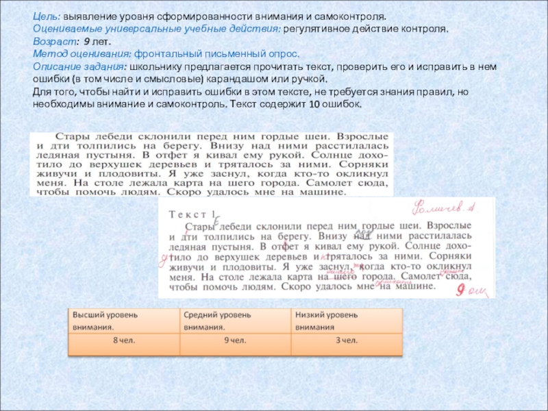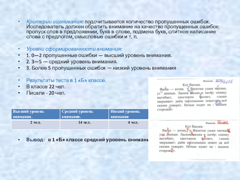 Критерии оценивания: подсчитывается количество пропущенных ошибок. Исследователь должен обратить внимание на