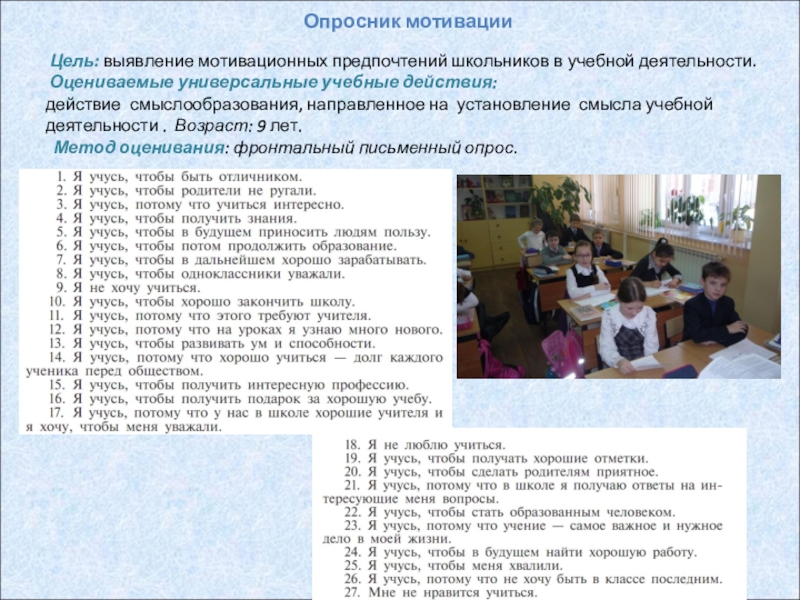 Цель: выявление сформированности внутренней позиции школьника, его мотивации учения.