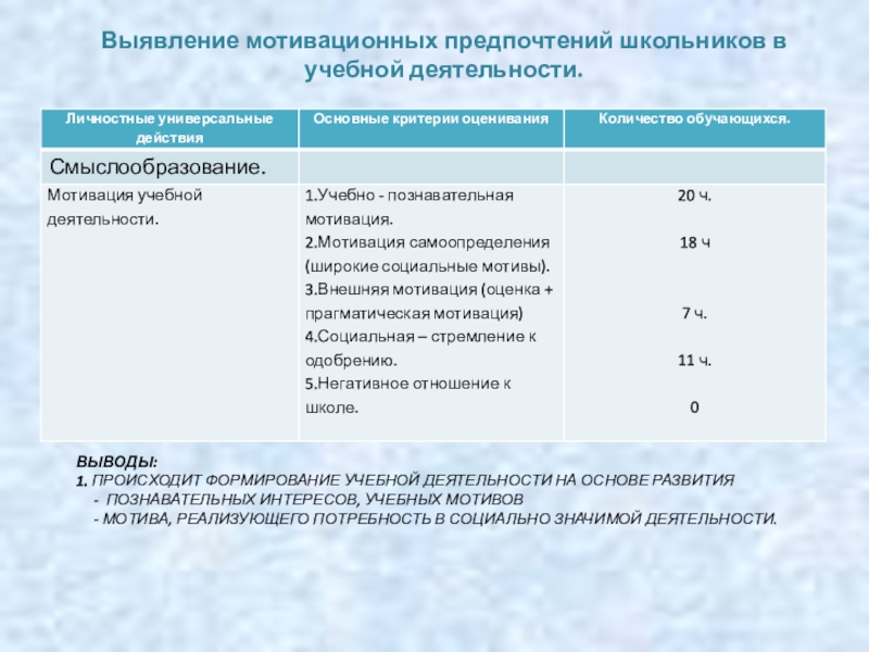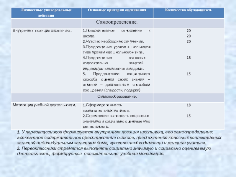 1. У первоклассников формируется внутренняя позиция школьника, его самоопределение: адекватное