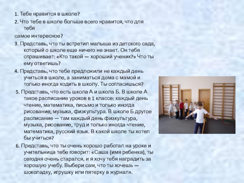 6. Представь, что ты очень хорошо работал на уроке и учительница тебе говорит: «Саша (имя ребенка), ты сегодня очень старался, и я хочу тебя наградить за хорошую учебу. Выбери сам, что ты хочешь — шоколадку, игрушку или пятерку в журнал».