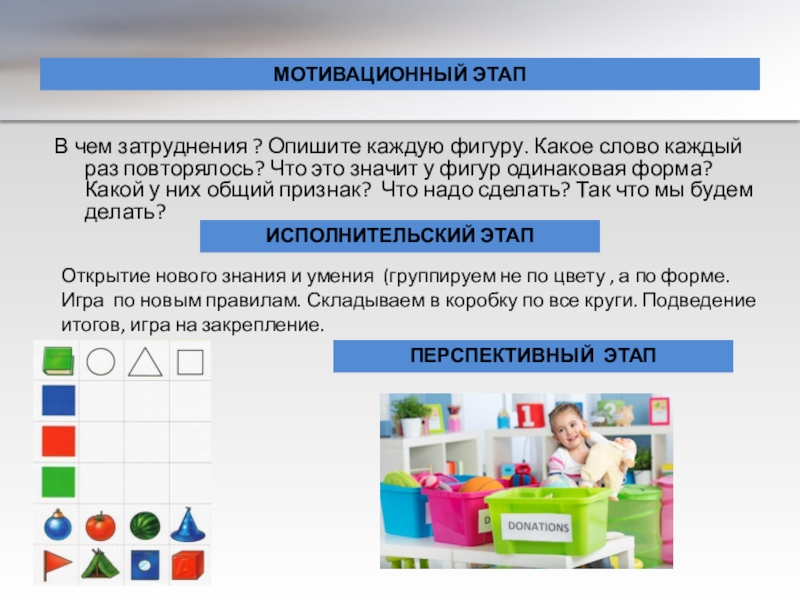 Открытие нового знания и умения (группируем не по цвету , а по форме. Игра по новым правилам. Складываем в коробку по все круги. Подведение итогов, игра на закрепление.