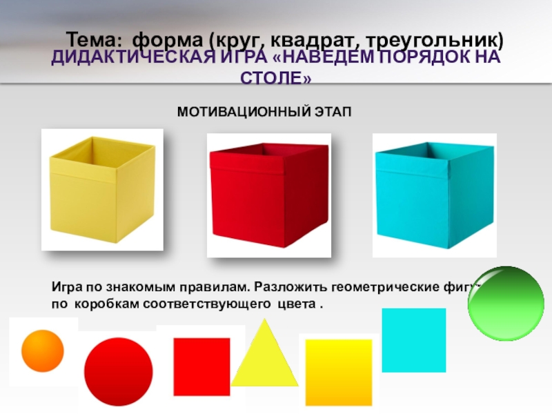 Игра по знакомым правилам. Разложить геометрические фигуры по коробкам соответствующего цвета .