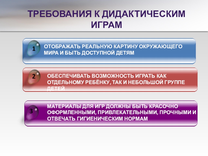 МАТЕРИАЛЫ ДЛЯ ИГР ДОЛЖНЫ БЫТЬ КРАСОЧНО ОФОРМЛЕННЫМИ, ПРИВЛЕКАТЕЛЬНЫМИ, ПРОЧНЫМИ И ОТВЕЧАТЬ ГИГИЕНИЧЕСКИМ НОРМАМ