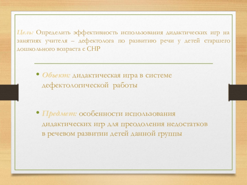 Слайд 3Цель: Определить эффективность использования дидактических игр на занятиях учителя – дефектолога