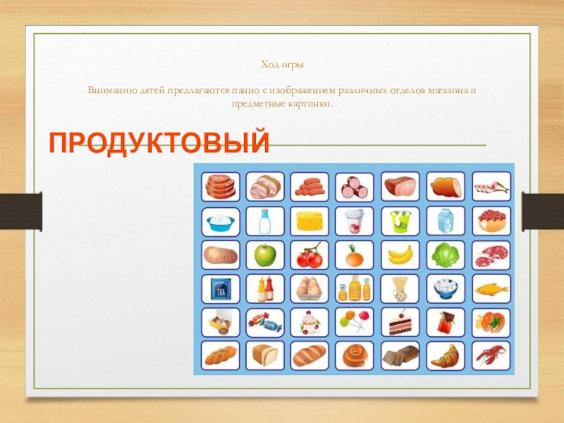 Оборудование. Несколько картонных панно с кармашками с изображением разных отделов магазина: «Овощи-фрукты», «Продуктовый», «Хлеб», «Мясо», «Молоко», «Посуда», «Одежда», «Обувь», «Хозтовары», «Бытовая техника», «Игрушки» и тд.; предметные картинки по каждой из названных тем, буквы и символы звуков (р, л, с, ш, ч, з, к, ц); фишки для поощрения детей.