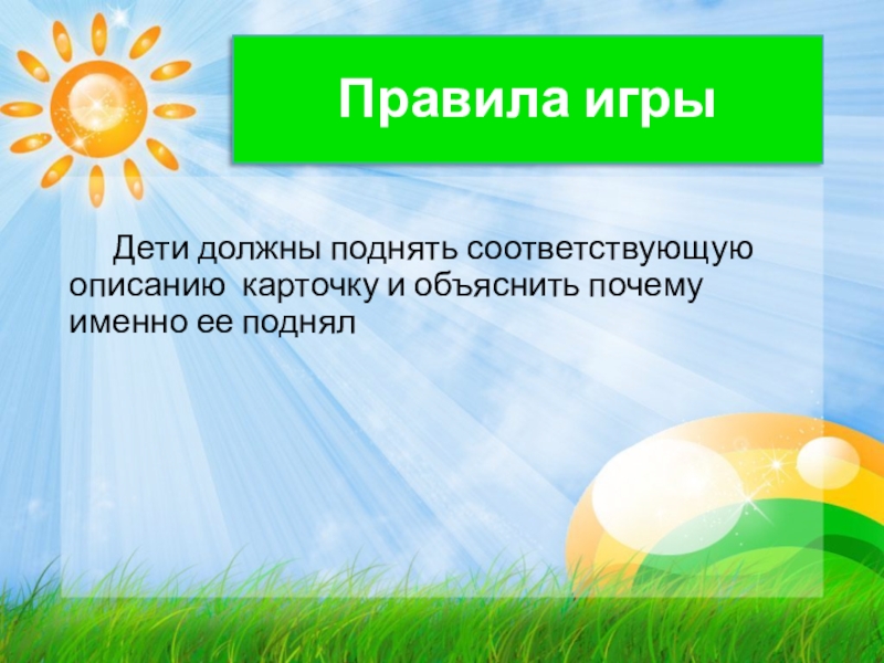 Правила игры 	Дети должны поднять соответствующую описанию карточку и объяснить почему именно ее поднял