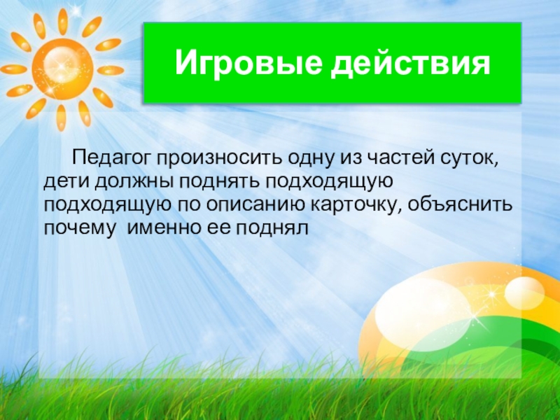 Игровые действия	Педагог произносить одну из частей суток, дети должны поднять подходящую подходящую по описанию карточку, объяснить почему