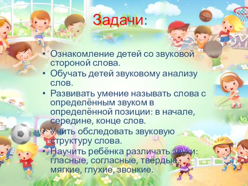 Задачи:Ознакомление детей со звуковой стороной слова. Обучать детей звуковому анализу слов.Развивать умение называть слова с определённым звуком в определённой позиции: в начале, середине, конце слов.Учить обследовать звуковую структуру слова.Научить ребёнка различать звуки: гласные, согласные, твёрдые, мягкие, глухие,