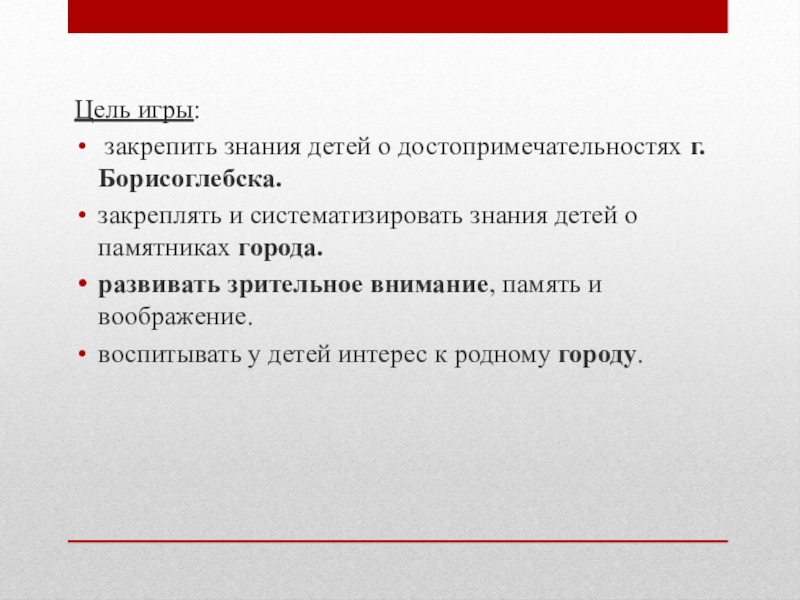 Цель игры: закрепить знания детей о достопримечательностях г. Борисоглебска.закреплять и систематизировать знания детей о памятниках города. развивать зрительное внимание, память и воображение. воспитывать у детей интерес к родному городу.