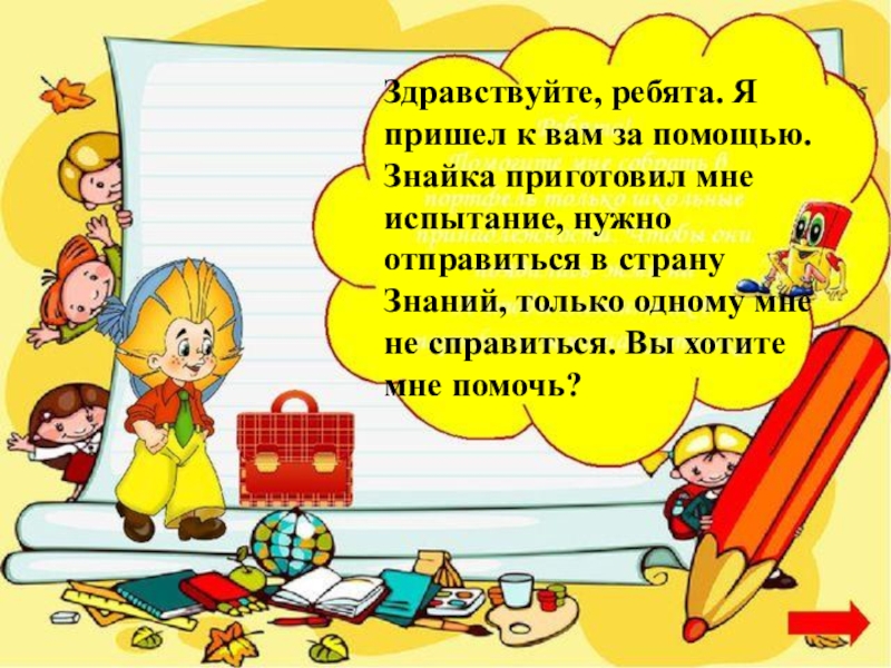 испытание, нужно отправиться в страну Знаний, только одному мне не справиться. Вы хотите мне помочь?