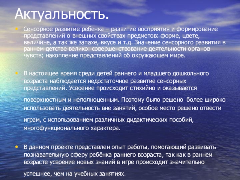 В настоящее время среди детей раннего и младшего дошкольного возраста наблюдается недостаточное развитие сенсорных представлений. Усвоение происходит стихийно и оказывается поверхностным и неполноценным. Поэтому было решено более широко использовать деятельность вне занятий, особое место решено отвести играм, с использованием различных дидактических пособий, многофункционального характера.