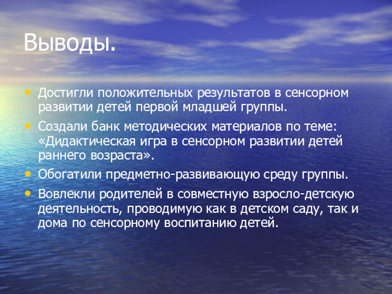 Вовлекли родителей в совместную взросло-детскую деятельность, проводимую как в детском саду, так и дома по сенсорному воспитанию детей.