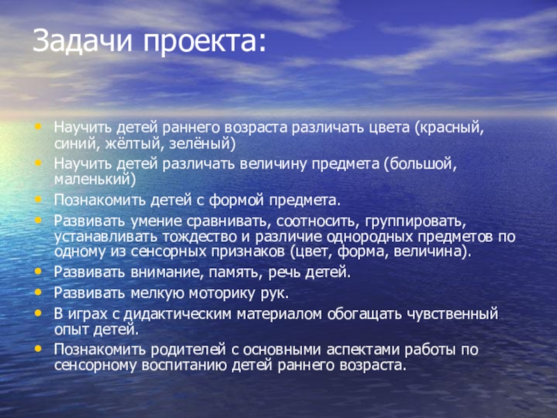 Познакомить родителей с основными аспектами работы по сенсорному воспитанию детей раннего возраста.