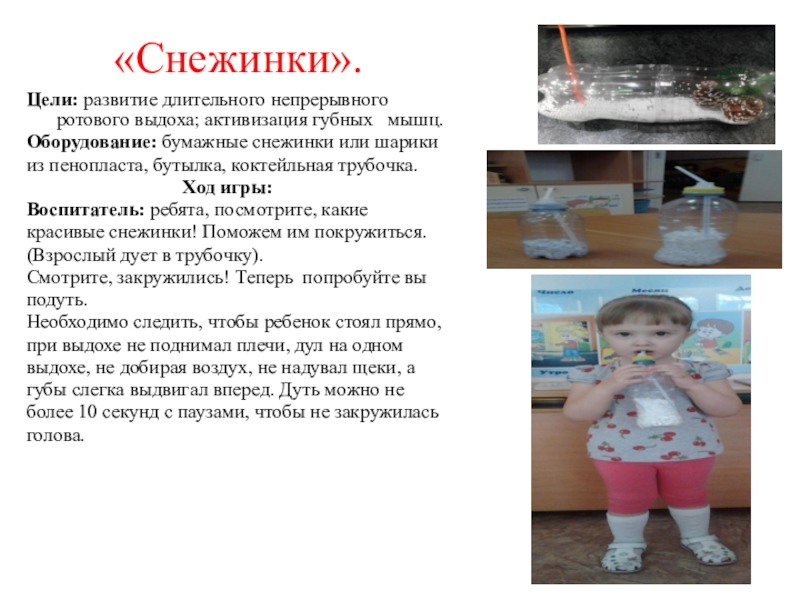 Цели: развитие длительного непрерывного ротового выдоха; активизация губных мышц.