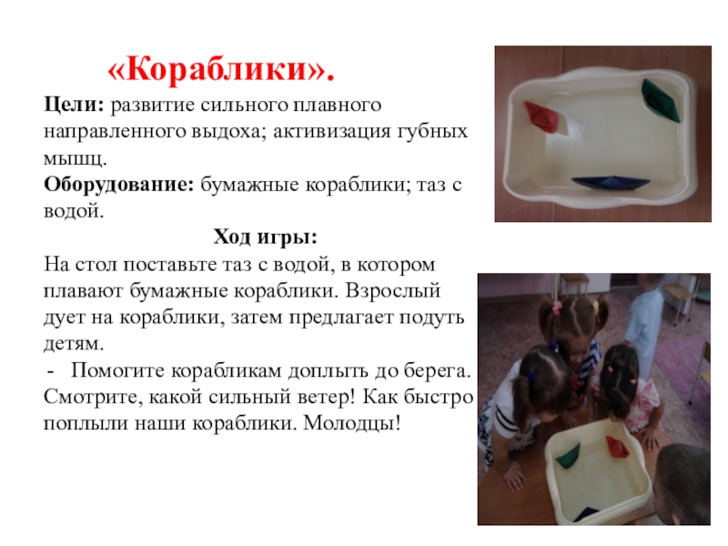 Цели: развитие длительного непрерывного ротового выдоха; активизация