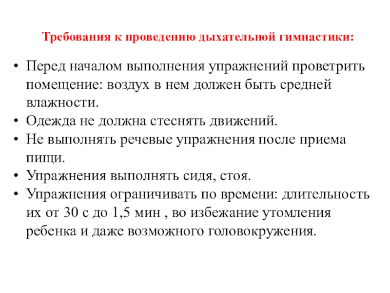 Слайд 3Требования к проведению дыхательной гимнастики:
