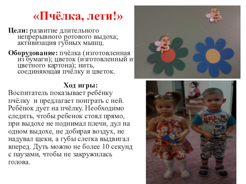 Оборудование: пчёлка (изготовленная из бумаги); цветок (изготовленный из цветного картона); нить, соединяющая пчёлку и цветок.