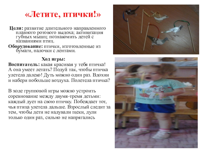 выдоха; активизация губных мышц; познакомить детей с названиями птиц.