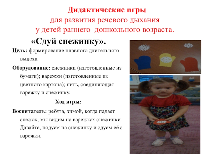 Воспитатель: ребята, зимой, когда падает снежок, мы видим на варежках снежинки. Давайте, подуем на снежинку и сдуем её с варежки.