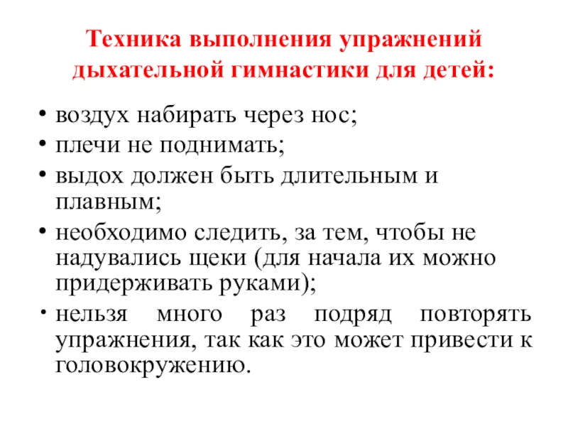 Слайд 4Техника выполнения упражнений дыхательной гимнастики для детей: