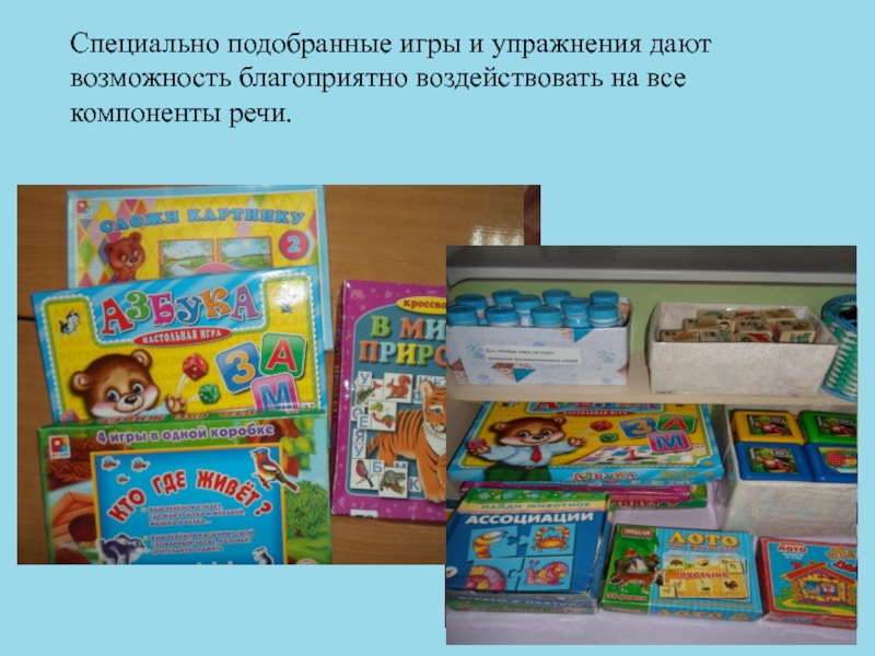 Слайд 7Специально подобранные игры и упражнения дают возможность благоприятно воздействовать на все
