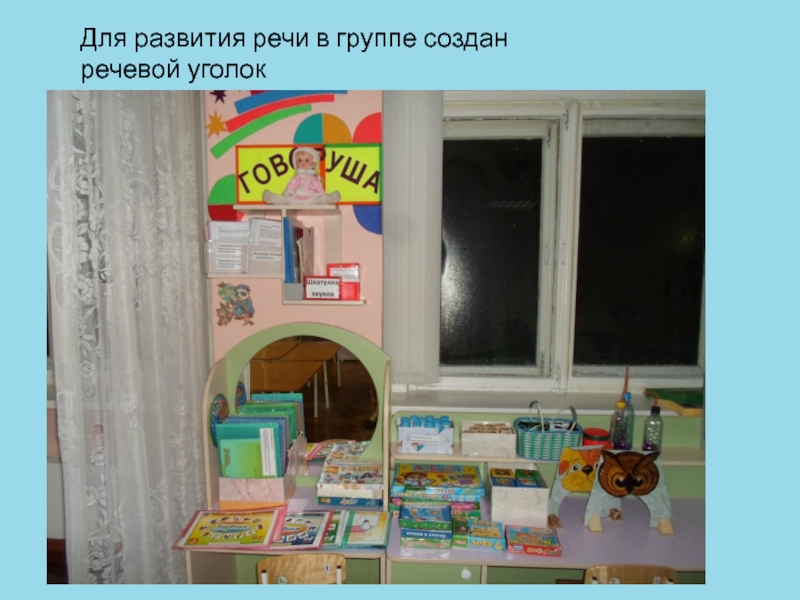 Слайд 14Для развития речи в группе создан речевой уголок