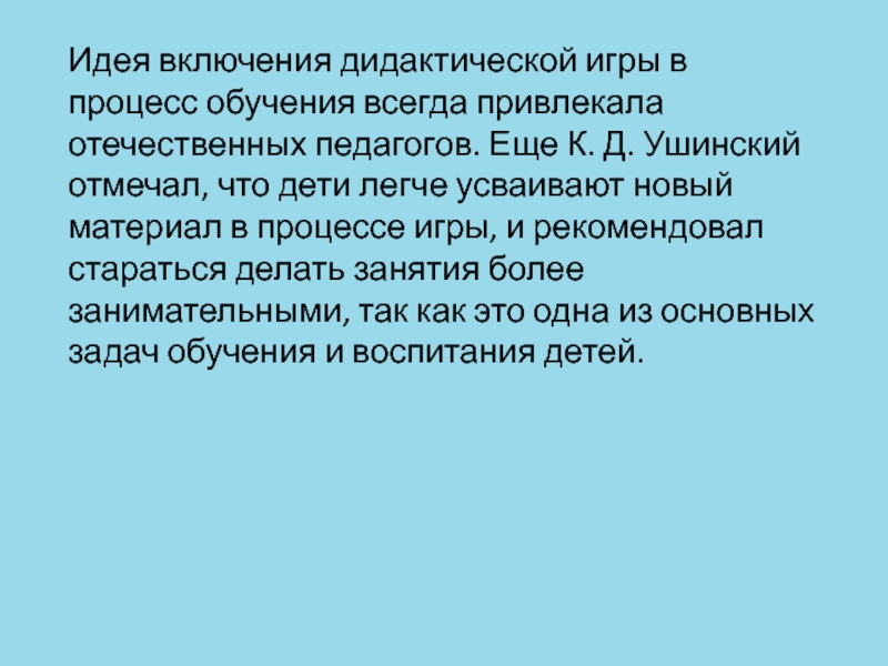 Слайд 6Идея включения дидактической игры в процесс обучения всегда привлекала отечественных педагогов.