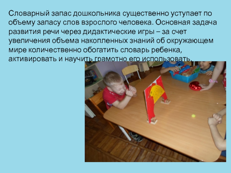 Основная задача развития речи через дидактические игры – за счет увеличения объема накопленных знаний об окружающем мире количественно обогатить словарь ребенка, активировать и научить грамотно его использовать.