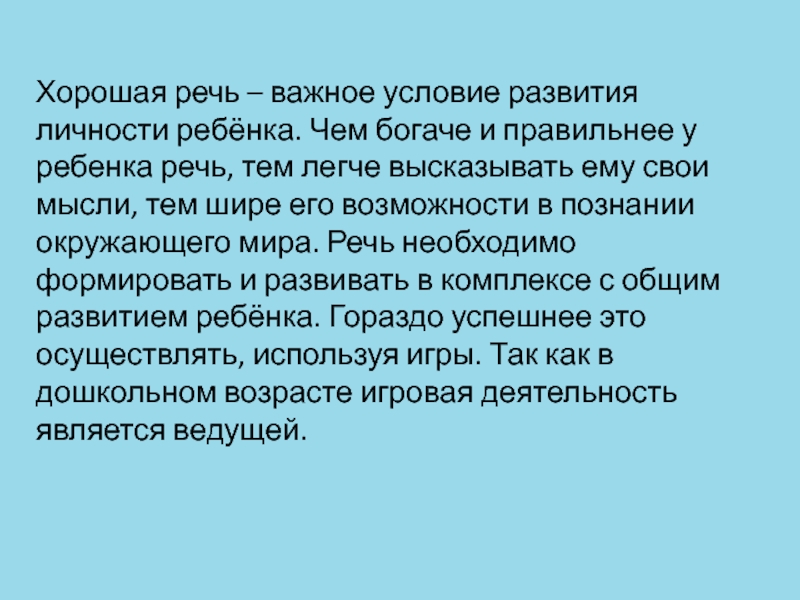 правильнее у ребенка речь, тем легче высказывать ему свои мысли, тем шире его возможности в познании окружающего мира. Речь необходимо формировать и развивать в комплексе с общим развитием ребёнка. Гораздо успешнее это осуществлять, используя игры. Так как в дошкольном возрасте игровая деятельность является ведущей.