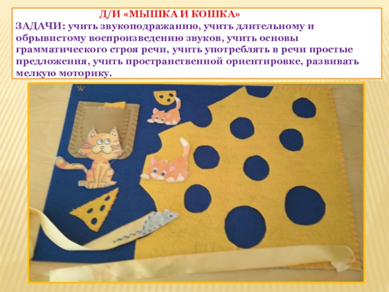 Задачи: учить звукоподражанию, учить длительному и обрывистому воспроизведению звуков, учить основы грамматического строя речи, учить употреблять в речи простые предложения, учить пространственной ориентировке, развивать мелкую моторику.
