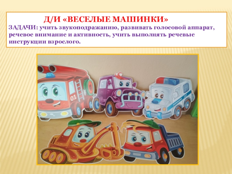 Задачи: учить звукоподражанию, развивать голосовой аппарат, речевое внимание и активность, учить выполнять речевые инструкции взрослого.