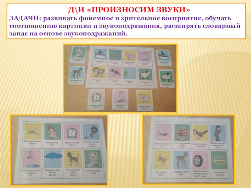 задачи: развивать фонемное и зрительное восприятие, обучать соотношению картинки и звукоподражания, расширять словарный запас на основе звукоподражаний.
