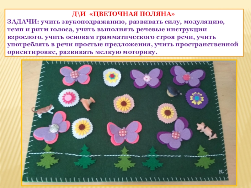 Задачи: учить звукоподражанию, развивать силу, модуляцию, темп и ритм голоса, учить выполнять речевые инструкции взрослого. учить основам грамматического строя речи, учить употреблять в речи простые предложения, учить пространственной ориентировке, развивать мелкую моторику.