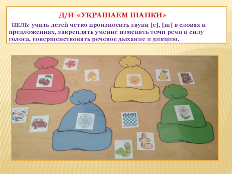 Цель: учить детей четко произносить звуки [с], [ш] в словах и предложениях, закреплять умение изменять темп речи и силу голоса, совершенствовать речевое дыхание и дикцию.