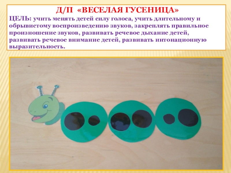 Цель: учить менять детей силу голоса, учить длительному и обрывистому воспроизведению звуков, закреплять правильное произношение звуков, развивать речевое дыхание детей, развивать речевое внимание детей, развивать интонационную выразительность.