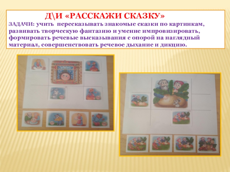 задачи: учить пересказывать знакомые сказки по картинкам, развивать творческую фантазию и умение импровизировать, формировать речевые высказывания с опорой на наглядный материал, совершенствовать речевое дыхание и дикцию.